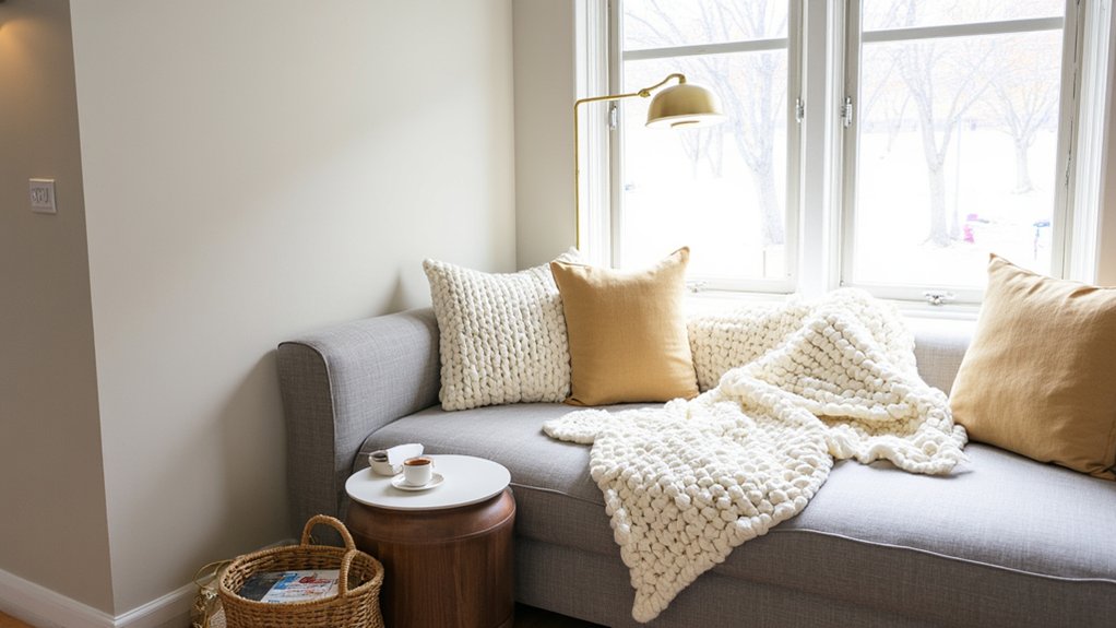 Layer in a soft throw blanket and confirm you’ve got at least 24 inches of clear space above the seating area for comfortable positioning while reading.