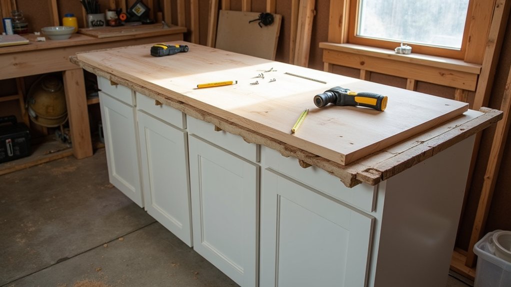 - Lay the plywood atop your cabinet frames, ensuring a 1-inch overhang on front.