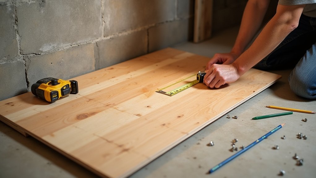 - Lay down a base layer of ¾-inch plywood, cut to fit.