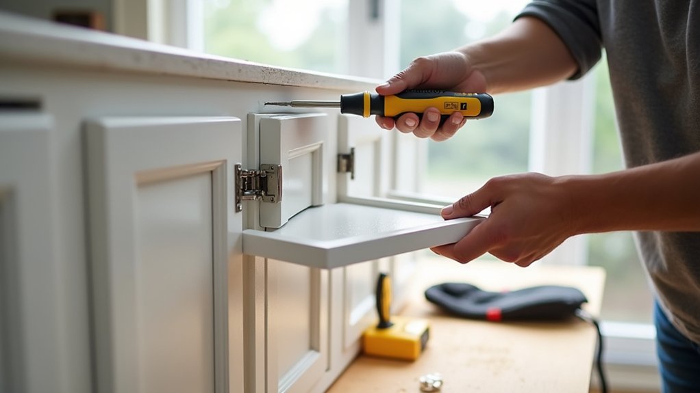 - Align hinges on the cabinet frame, securing with screws; tighten after a 5-minute check.