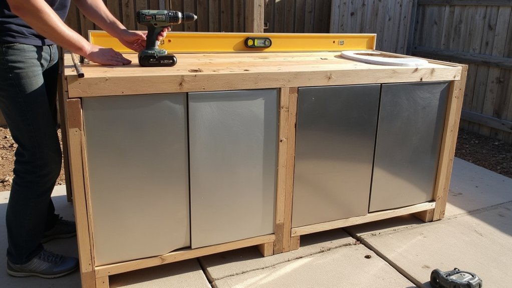 While you’ve got the structure secured, let’s move on to installing outdoor cabinetry to boost functionality and style. These cabinets store gear and enhance your kitchen’s look, so let’s get started with precision.