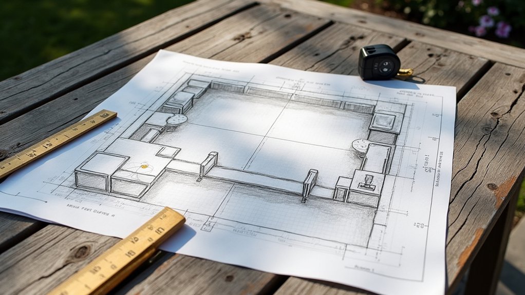 Before diving into your outdoor kitchen project, take a moment to plan and prepare to avoid costly mistakes. You’ve gotta think about the space and layout first. Measure your backyard area—at least 10×12 feet for a basic setup—and sketch a design.