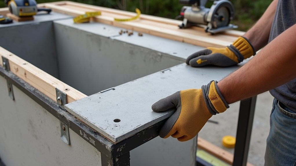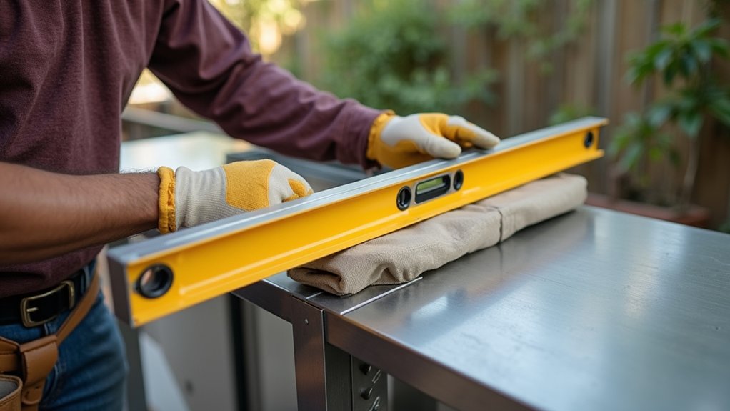 After securing your weatherproof sheathing, it’s time to focus on adding countertop support to confirm a sturdy workspace. You’ll need strong brackets or cross-bracing for stability.