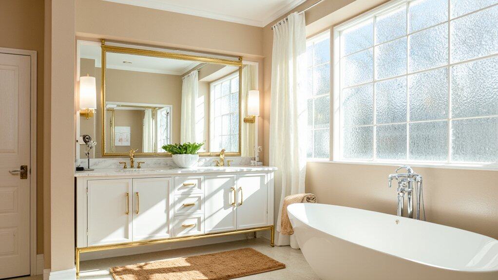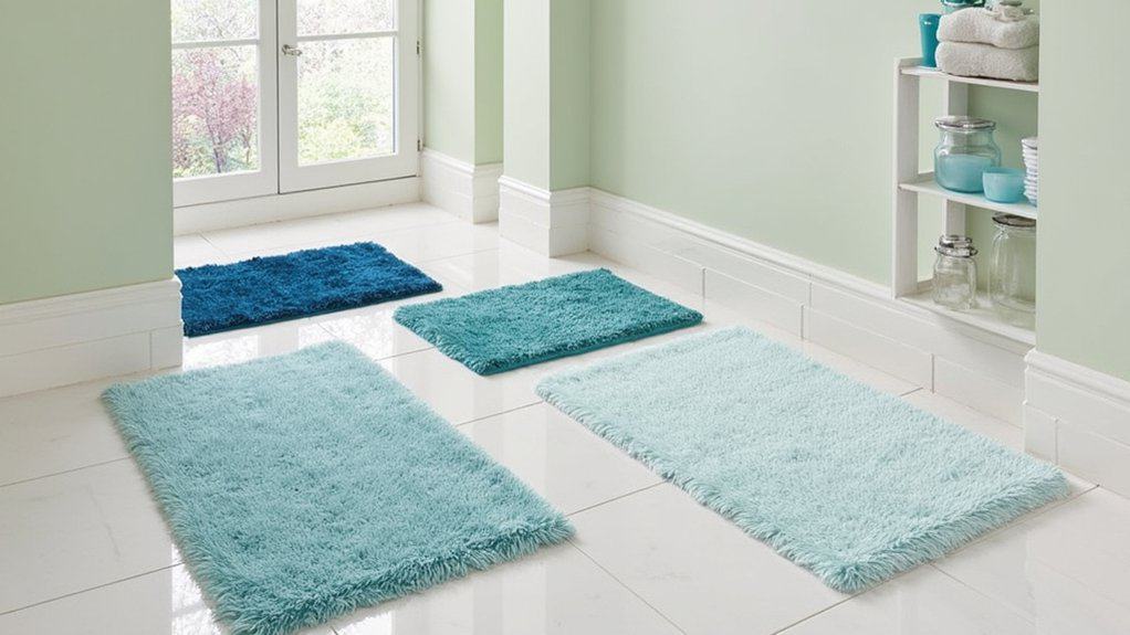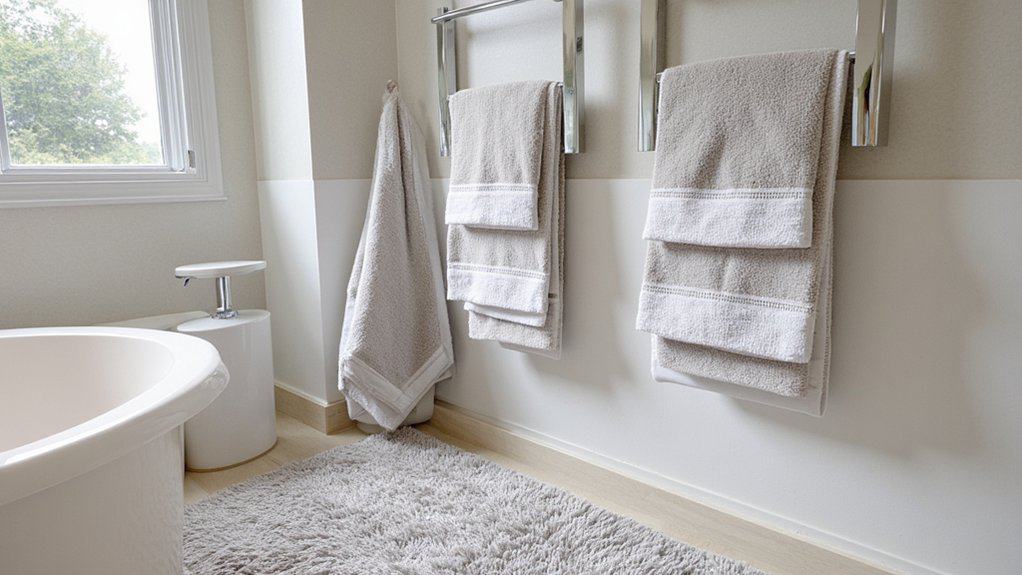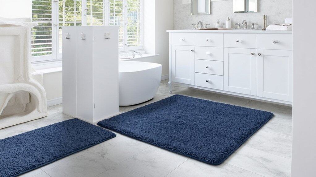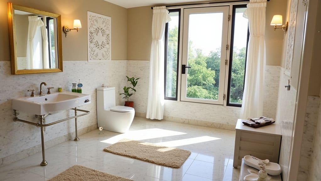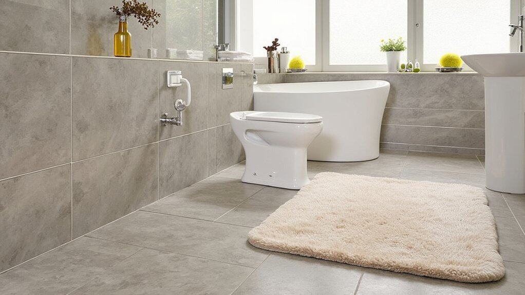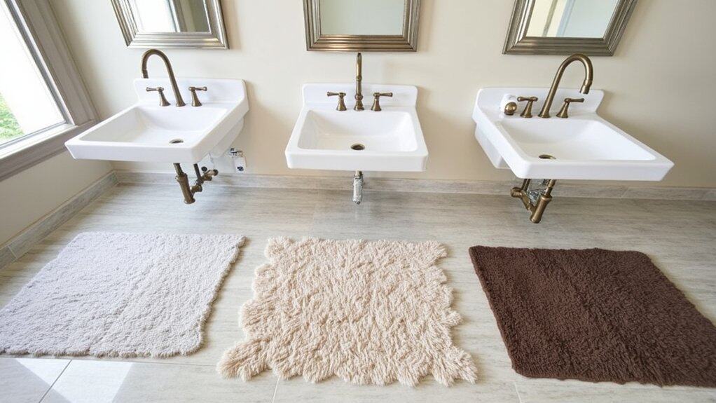 Faucet-finish harmony can elevate your bathroom’s style when you align your rug color with those metallic tones. Don’t overlook this detail; it ties your space together effortlessly.