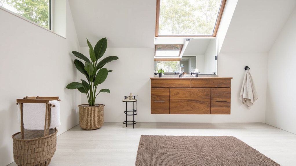 While considering your bathroom rug color, don’t overlook the cabinets as a key matching element. They set the tone for your bathroom’s style, so coordinating hues creates a cohesive look. Start by evaluating your cabinet shade—whether it’s dark oak, white, or gray.