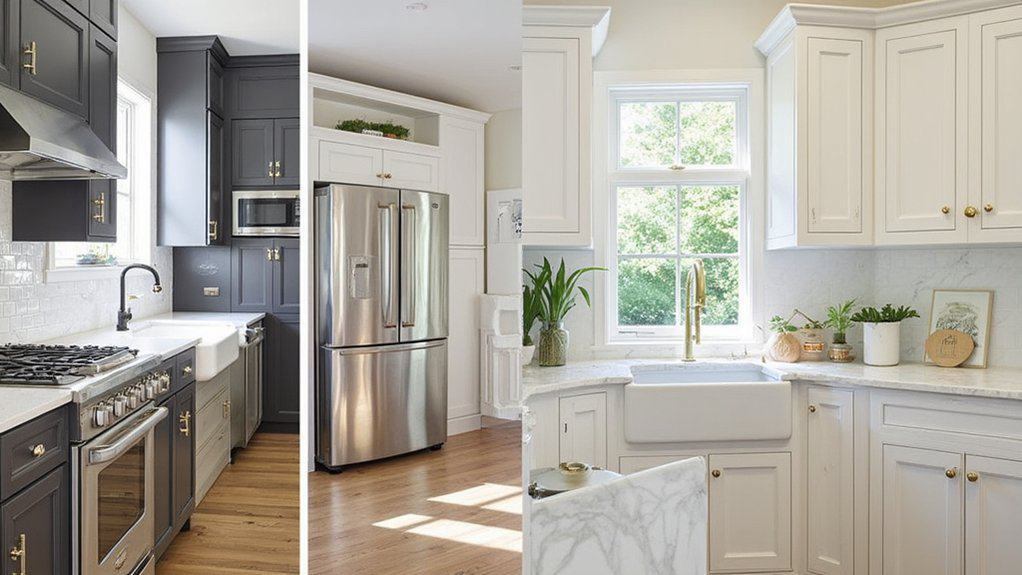 Several key factors come into play when you’re balancing function with design for your kitchen backsplash. You’ve gotta think about durability and style together, ensuring the material withstands daily wear. A standard backsplash height of 18-24 inches protects walls from splashes, while the look ties into your kitchen’s vibe.