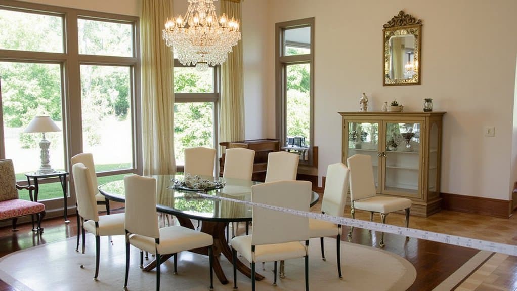 Before you pick a chandelier, let’s get a handle on your dining room’s dimensions to guarantee a perfect fit. You’ve gotta know the space you’re working with, so grab a tape measure and get started. A chandelier shouldn’t overwhelm or underwhelm your room, and size matters.