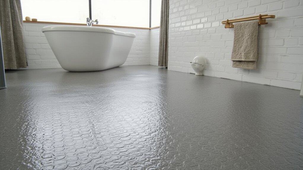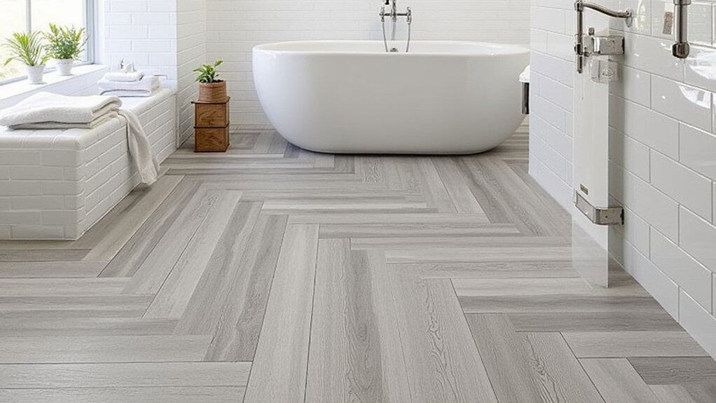 While mosaics offer stunning detail, let’s explore vinyl tiles for a versatile bathroom floor option. You’ll love how these tiles fit any style or budget, often costing less than $2 per square foot. They’re easy to install and maintain, saving you time.