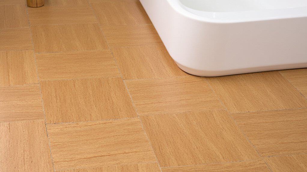 Let’s plunge into cork tiles as a cozy option for your bathroom floor. You’ll love their soft, warm feel underfoot, especially in a 5×7-foot bathroom space. Cork’s natural cushioning reduces strain on your feet, making it ideal for long morning routines.
