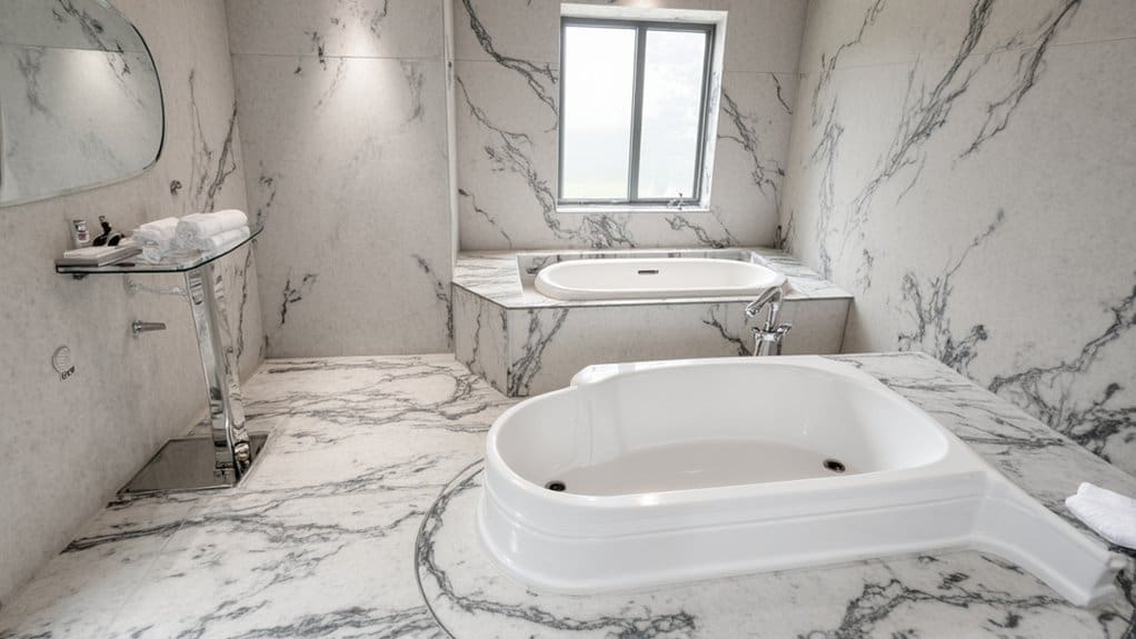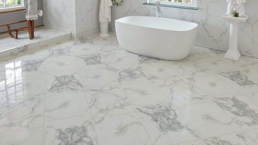 After exploring bamboo’s eco-friendly appeal, turn your attention to marble tiles for a luxurious bathroom floor upgrade. Marble offers unmatched elegance with its natural veining and polished finish, transforming your space into a spa-like retreat. You’ll find it in various sizes, like 12×12 inches or 24×24 inches, perfect for any bathroom layout.
