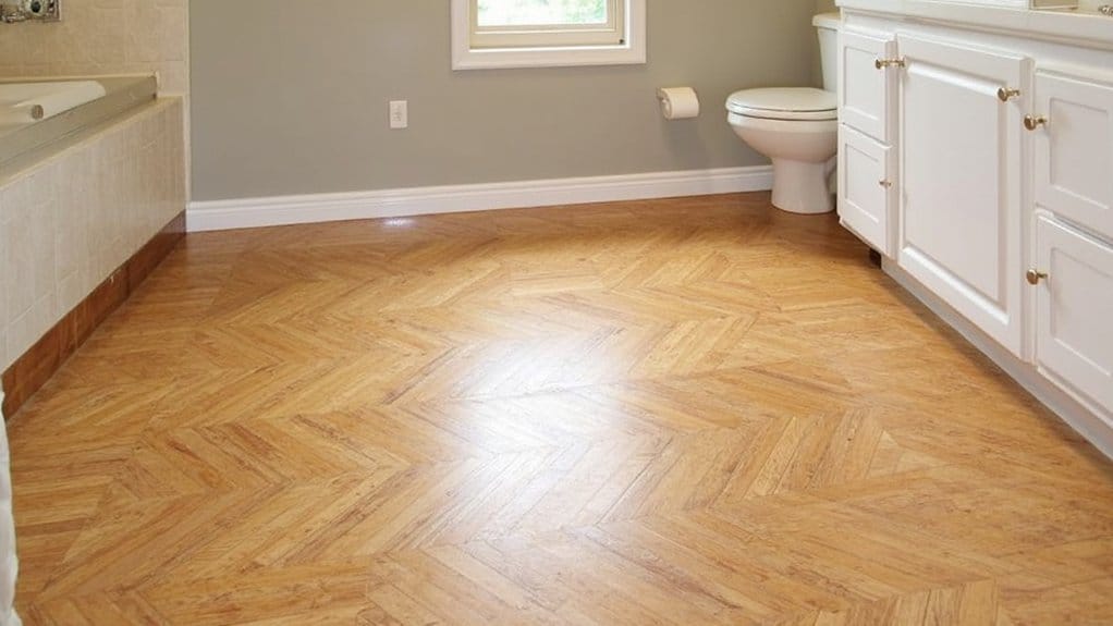 Switching gears from cork’s cozy charm, consider bamboo tiles for a sustainable bathroom flooring choice. You’ll love how eco-friendly they are, growing back in just 3-5 years compared to decades for hardwood. Install them easily with standard 12×12 inch tiles, ensuring a green upgrade in one weekend.
