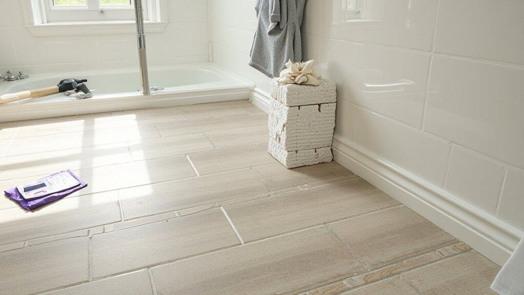 Let’s shift focus to vinyl tiles, a budget-friendly option for your bathroom makeover that still packs style. You can transform your space without breaking the bank, as vinyl often costs $1 to $5 per square foot. Installation’s a breeze too, taking just a weekend for a 5×8-foot bathroom.