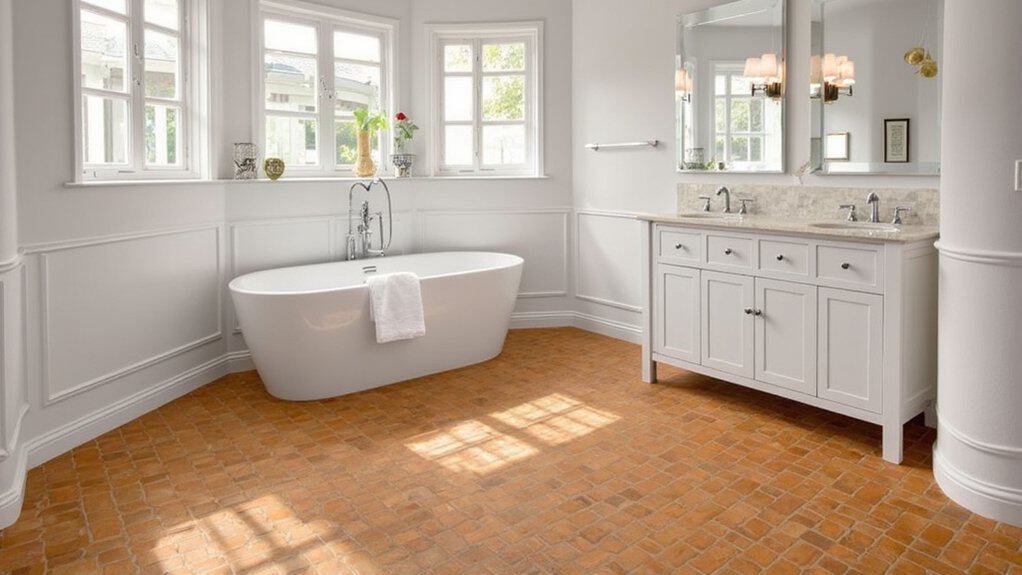 While vinyl offers a cool, budget-friendly vibe, terracotta tiles bring a cozy, earthy warmth to your bathroom space. You’ll love how their rustic charm transforms your room with natural tones. Install them on floors or walls for a timeless look.