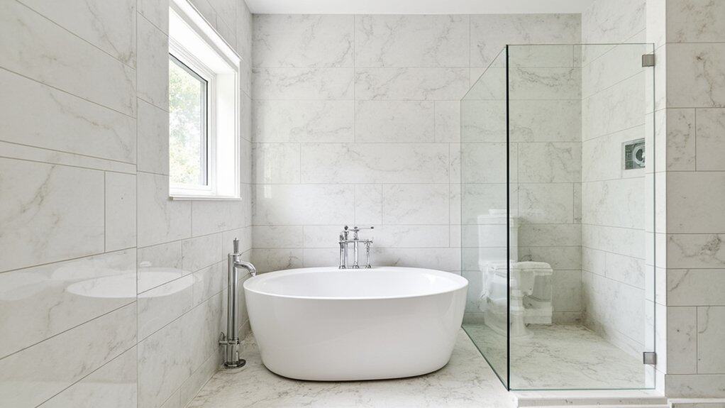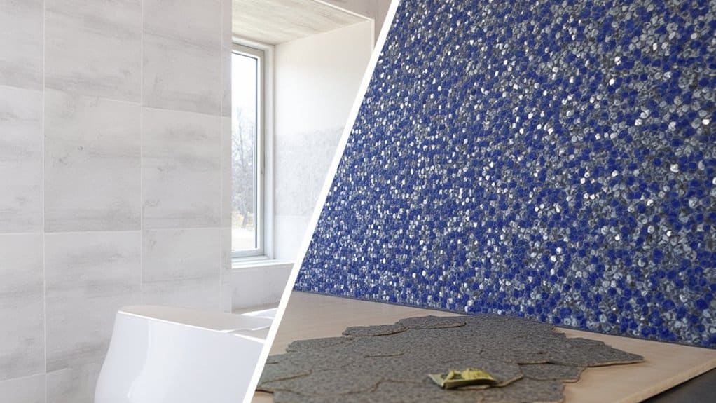 While ceramic tiles offer durability, let’s explore why porcelain tiles stand out for their incredible strength in bathrooms. You’ll find these tiles resist wear like champs, perfect for high-traffic spaces. They’re fired at over 2000°F, making them denser and tougher than ceramic.