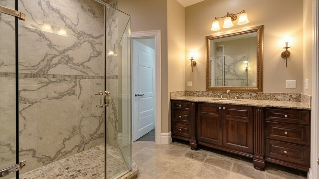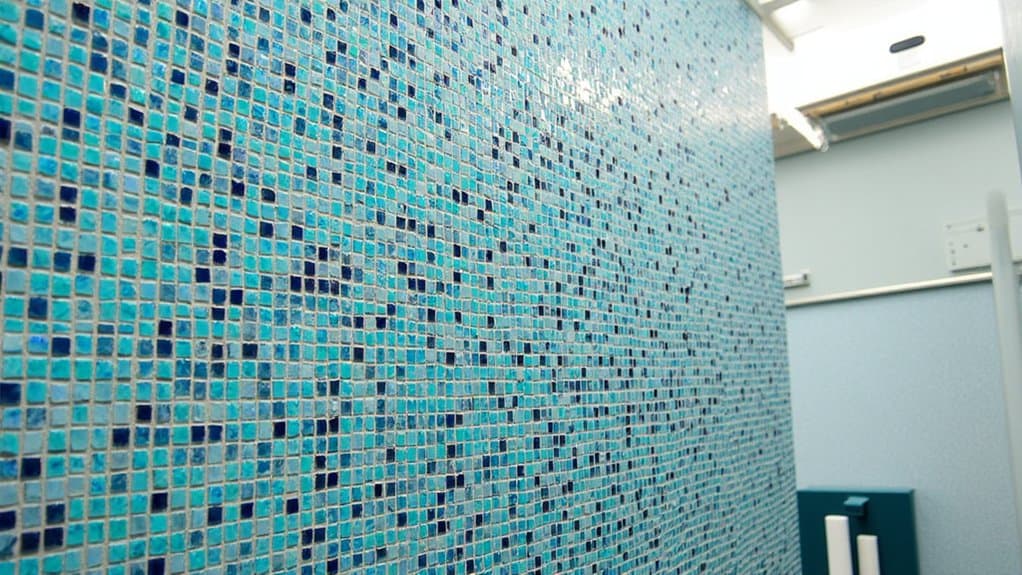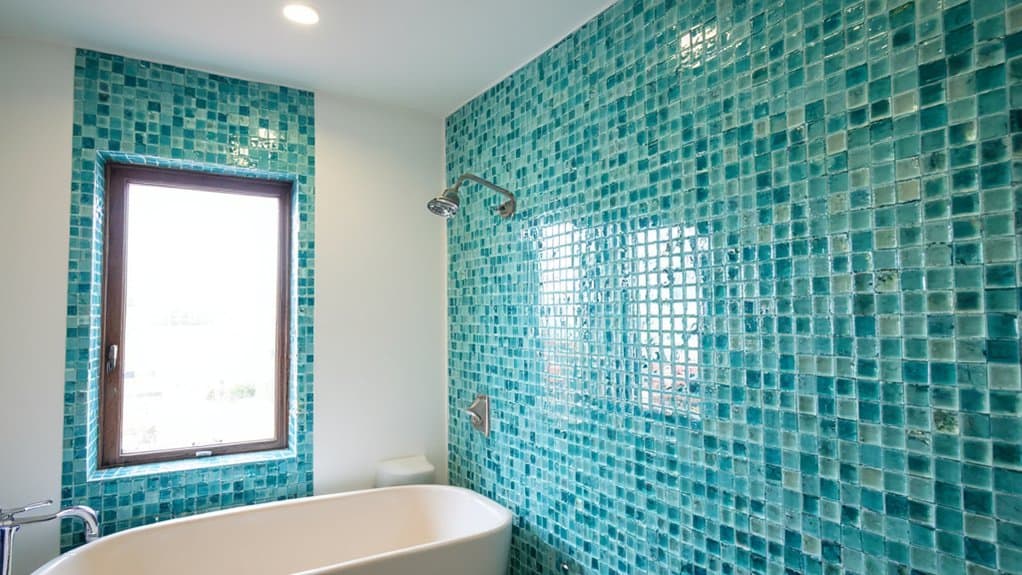 As you explore bathroom tile options, consider mosaic tiles for their incredible versatility and style. These small tiles, often 1-2 inches square, can transform your space with unique patterns. You’ll find they work on floors, walls, or even shower niches in about 3-5 days of installation.