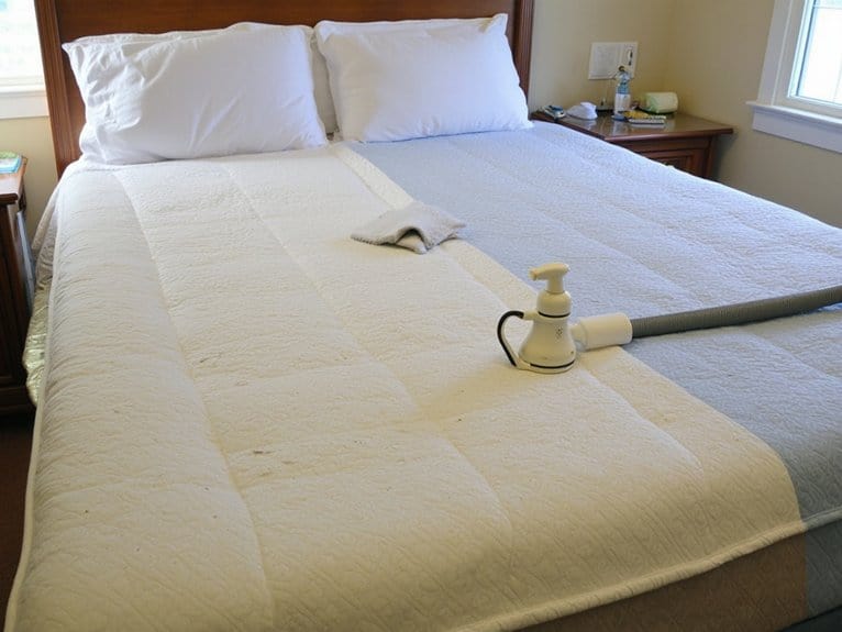 Before starting your cleaning schedule, perform a thorough mattress inspection. Check for visible stains, odors, or signs of wear. Note any problem areas that’ll need extra attention during cleaning. You’ll want to examine the top, sides, and even underneath the mattress to create a detailed cleaning plan that addresses all issues effectively.