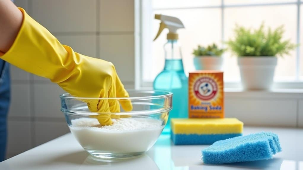Immerse yourself in cleaning with a powerful baking soda scrub to tackle tough stains on your bathroom shower tiles. This method’s a game-changer for grime! Mix a paste and get scrubbing with these vivid steps.