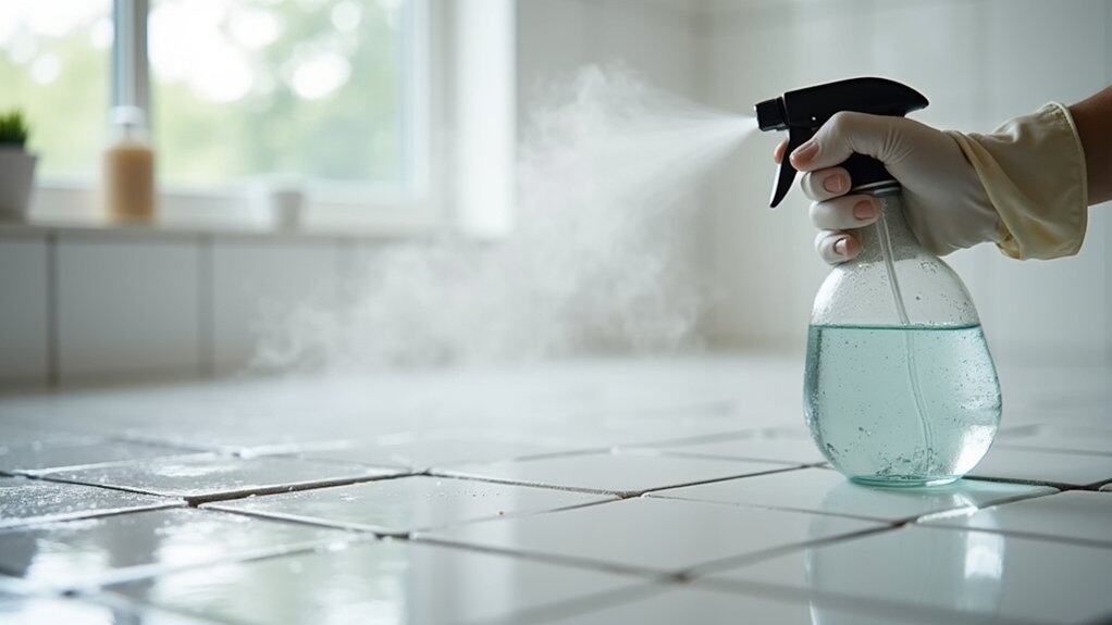 - Spray Generously – Coat the tiles evenly, focusing on grout lines for 10 minutes.