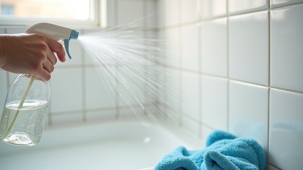 Now that you’ve got your materials, let’s tackle cleaning those shower tiles with some proven methods. You can try the Vinegar Soaking Technique, the Baking Soda Scrub, or the Hydrogen Peroxide Application to get rid of grime. As expert cleaner Jane Smith says, “These approaches work wonders if you’re consistent with a weekly 15-minute routine.”
