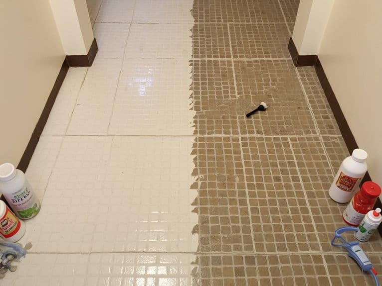 While oxygen bleach offers a gentle cleaning solution, chlorine bleach remains the most powerful option for restoring dingy white grout to its original brightness. For ideal grout maintenance, proper chlorine safety measures are essential. These include: