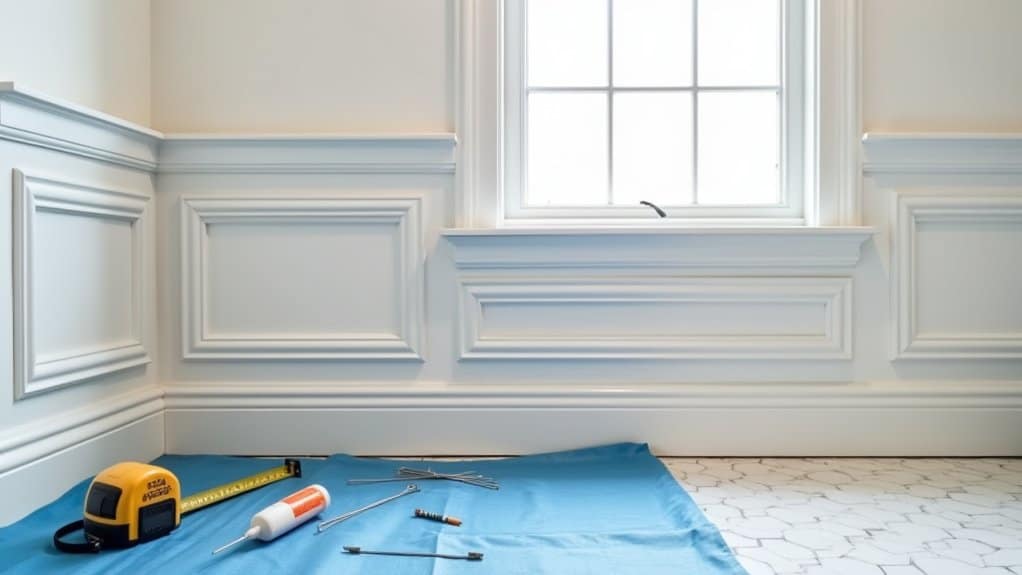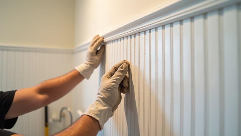Start installing your wainscoting panels with confidence to transform those bathroom walls into a stylish shield against moisture. You’ve got adhesive ready, so let’s get going with precision.