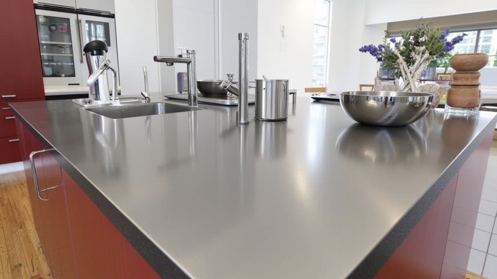 Consider stainless steel overlays as a sleek, modern upgrade for your kitchen tile countertops. They’re durable, easy to clean, and give a professional vibe. You can install them over existing tiles, saving time and mess, typically in just 4-6 hours for a standard 25-square-foot counter.