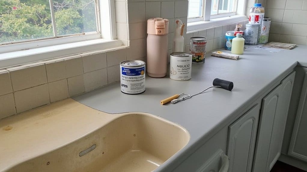 Dive right into transforming your kitchen by installing a laminate overlay on those dated tile countertops. You’ve got this! Start by preparing the surface to guarantee a smooth base, taking about 2 hours for a 6-foot countertop. “A clean, even surface is critical for durability,” says contractor Jane Smith.