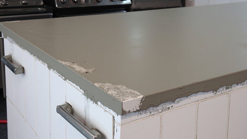 While laminate sheets offer one way to revamp your kitchen, a concrete countertop coating brings a modern, industrial vibe you’ll love. It’s durable and easy to apply over old tile with proper prep. You’ll transform your space in a weekend!
