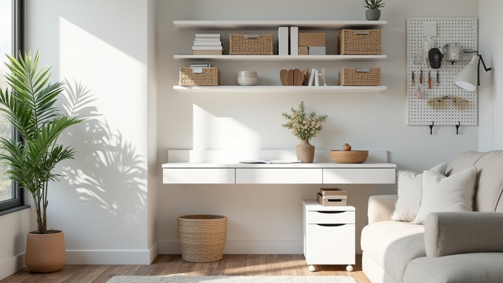 Managing paperwork, supplies, and equipment requires smart storage solutions that won’t overwhelm your living room’s existing layout. Consider these practical options: