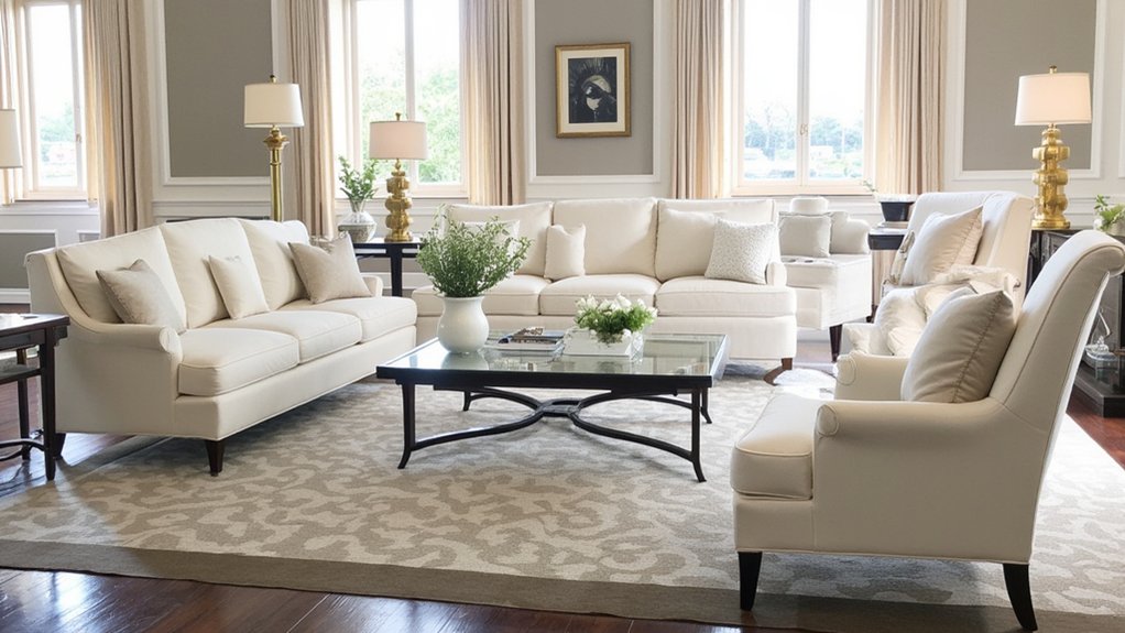 - Place an area rug (minimum 8×10 feet) to define each seating zone