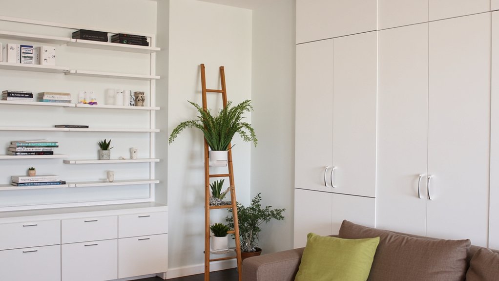 - Incorporate slim ladder shelving units (72 inches tall, 24 inches wide) in corners for displaying plants and accessories
