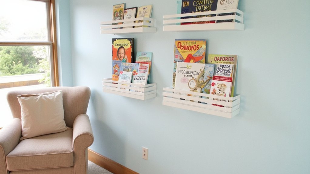 - Mount floating shelves with rounded corners at toddler eye level (28 inches) to display book covers facing forward