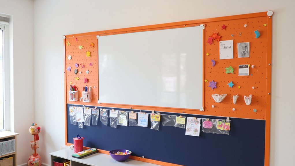 A child-height activity board serves as an engaging centerpiece that lets you maximize vertical wall space while encouraging creative play. Install your board 24-36 inches from the floor, ensuring it’s easily accessible for little hands.