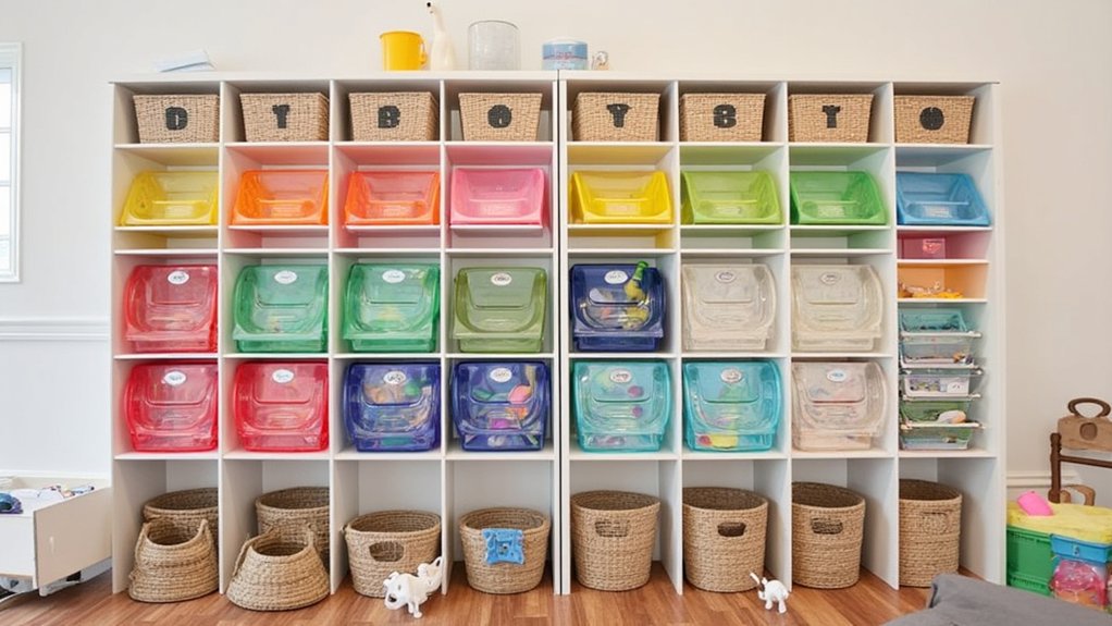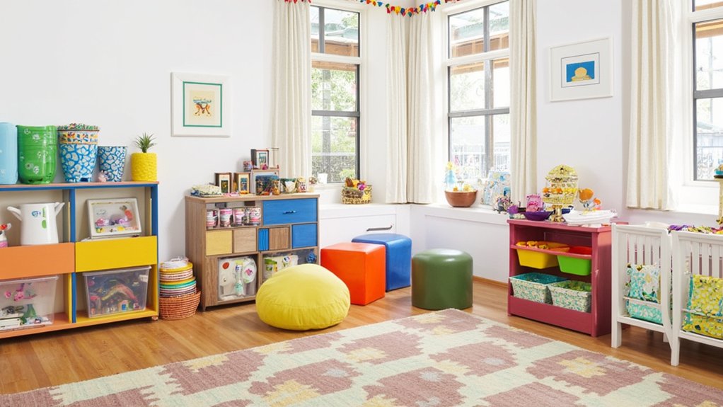 Colorful storage bins provide essential organization while adding vibrant pops of color to enliven your child’s playroom space. You’ll want to choose sturdy containers that can withstand daily use while keeping toys easily accessible.