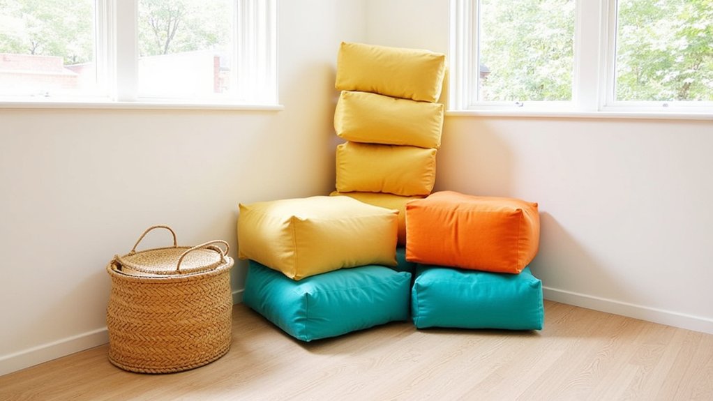 Since comfort plays a key role in any playroom, soft floor cushions create inviting spaces where kids can relax, read, and play. You’ll want to select cushions that are durable, washable, and sized appropriately for your children’s age group.