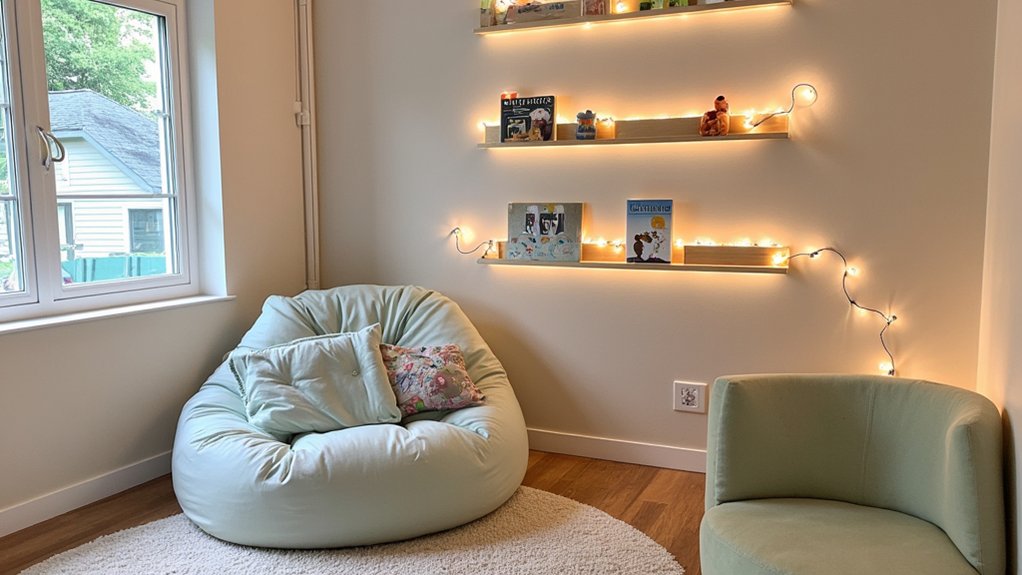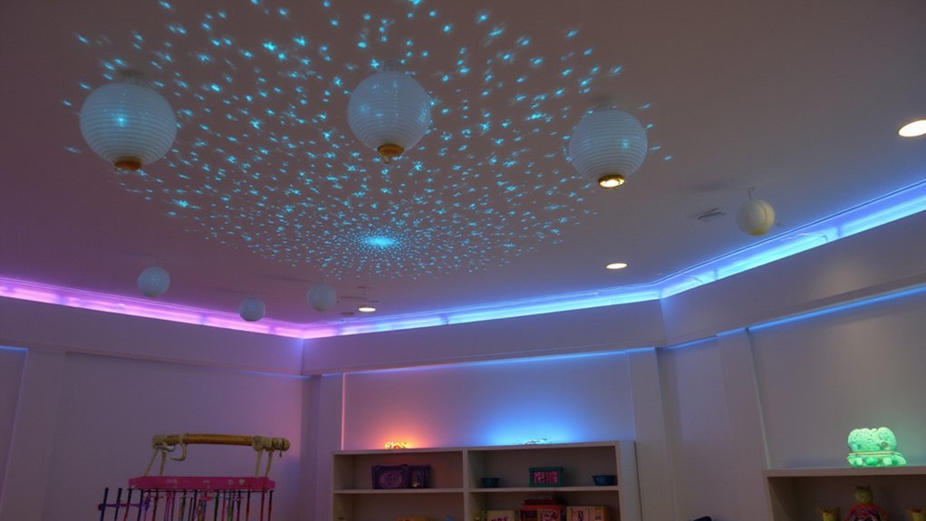 Proper lighting transforms an ordinary playroom into a magical space where kids can let their imaginations soar during playtime and creative activities. To create enchanting light features that’ll spark creativity while maintaining safety, consider these illuminating options:
