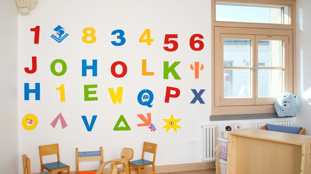 - Select alphabet decals with uppercase and lowercase letters (4-6 inches tall) to help with letter recognition
