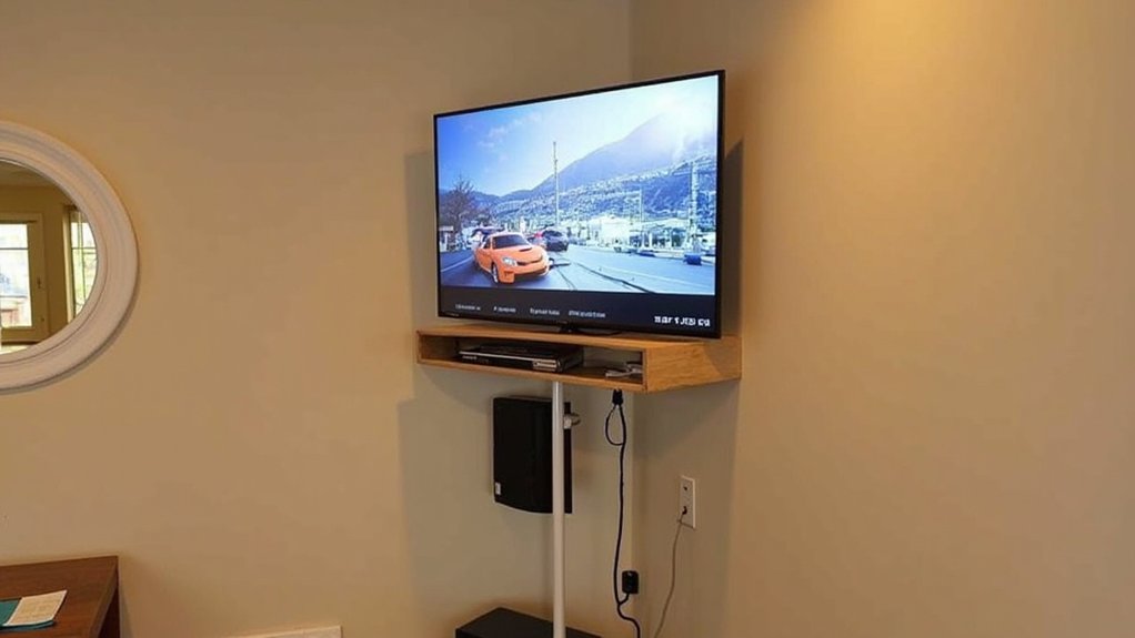 A corner TV mount maximizes space in your small den while creating an ideal viewing angle for everyone in the room. “Select a mount that can support your TV’s weight and screen size,” advises home designer Sarah Chen. When installing your corner mount, maintain 42-48 inches from the floor to the TV’s center for best viewing comfort.