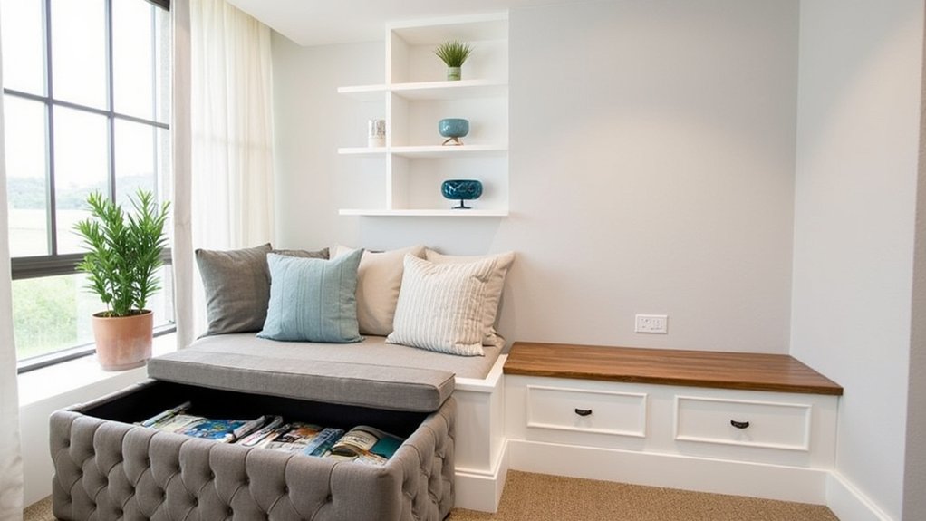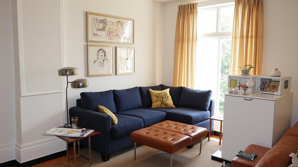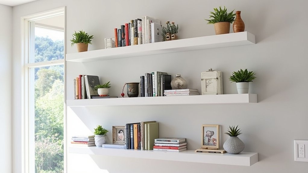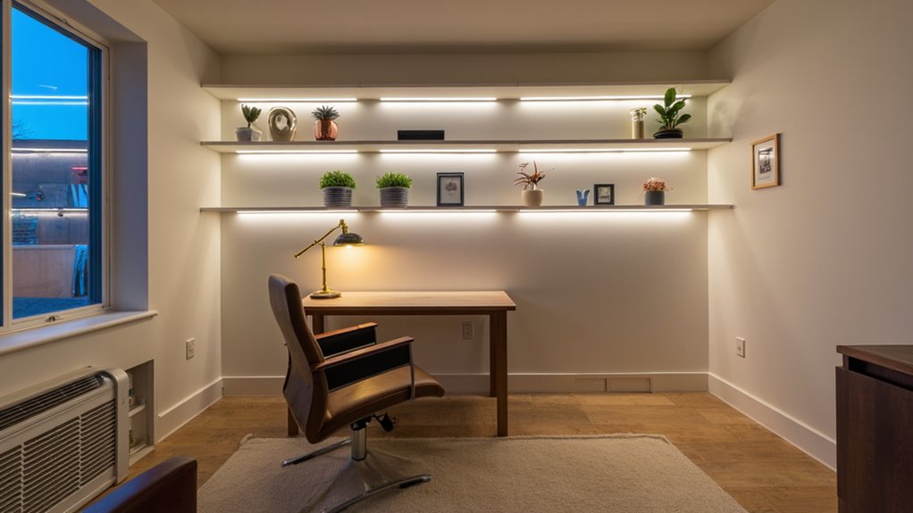 Floating wall shelves offer smart storage solutions while keeping your den’s limited floor space completely open. You’ll maximize vertical space while creating an organized, stylish look that draws the eye upward, making your room feel larger.