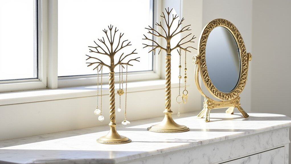 Elegance takes center stage as you add a dainty gold jewelry stand to your bedroom decor. This petite piece, ideally 8 inches tall and 5 inches wide, transforms clutter into charm on your dresser. Place it near natural light to catch subtle gleams, enhancing your space within minutes.