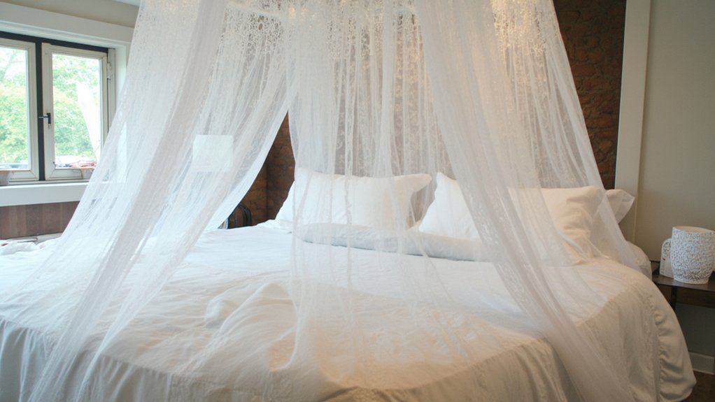 Revamping your bedroom’s look after adding scented candles can involve a stunning delicate lace canopy for extra charm. You’ll create a dreamy vibe by draping lace over your bed frame. Choose a canopy measuring 84 inches long to cover a standard queen bed, and install it within an hour using ceiling hooks.