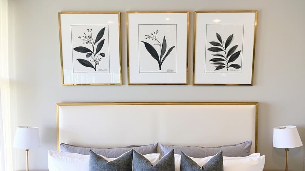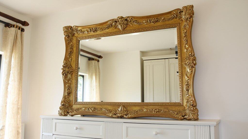 While you’re enhancing your bedroom’s charm, consider adding a vintage mirror frame for a touch of timeless style. It’s an easy way to elevate your space with elegance. Look for a frame around 36×24 inches, ideally with ornate carvings or a distressed gold finish, to hang above your dresser.