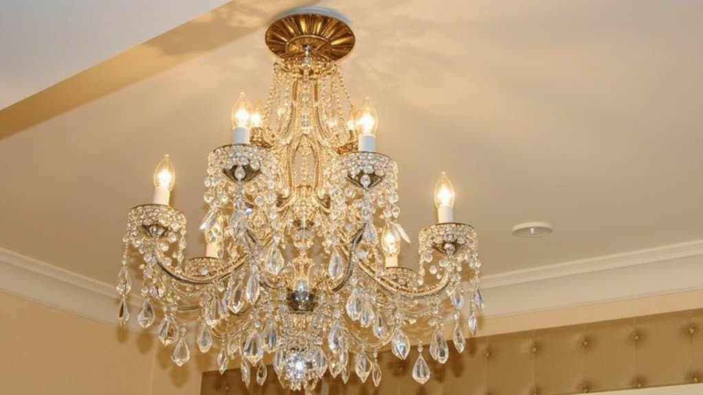 Let’s shift from the elegance of a vintage mirror frame to adding a stunning centerpiece with a glamorous crystal chandelier. You’re transforming your bedroom into a luxurious haven, and this fixture, ideally 24-30 inches in diameter, accomplishes the trick.
