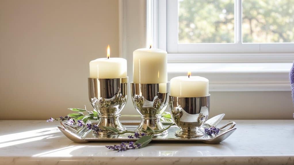 As you refine your bedroom’s ambiance, consider adding luxurious scented candles for a touch of warmth and sophistication. They’re an easy way to elevate the mood with calming fragrances like lavender or vanilla. Place them on a small tray—around 12 inches wide—on your nightstand for safety and style. Light them for 30 minutes before bedtime to unwind.