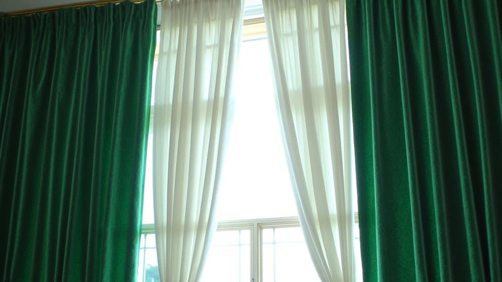 Elegance flows effortlessly into your bedroom when you add chic velvet curtains to frame your windows. They’re luxurious, transforming a plain space into a cozy retreat with rich texture. Hang them high, about 6 inches above your window frame, using rods that extend 8-12 inches beyond each side for fullness.