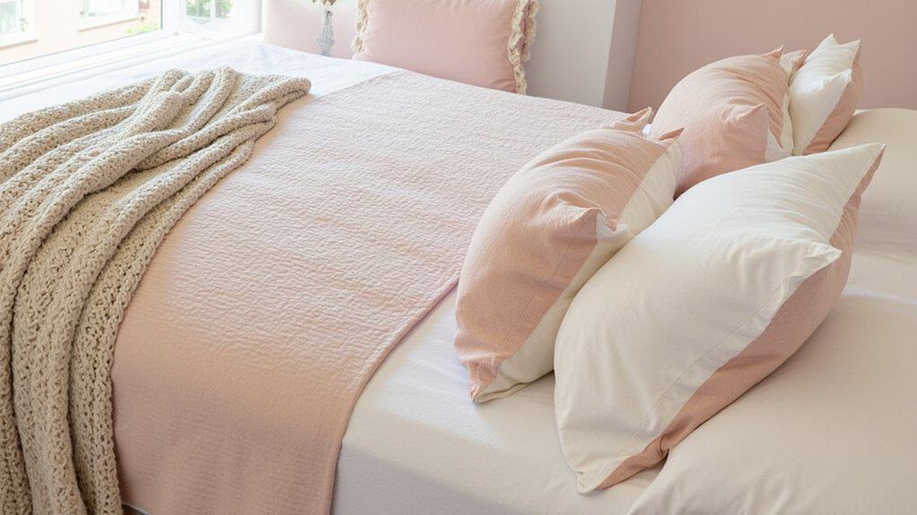 Let’s plunge into creating a cozy vibe with soft pink bedding, a perfect starting point for a woman’s bedroom. You’ll transform your space with this calming hue. Start by choosing a quality comforter or duvet in soft pink, ideally 100% cotton for breathability, sized for your bed (queen: 90×90 inches).