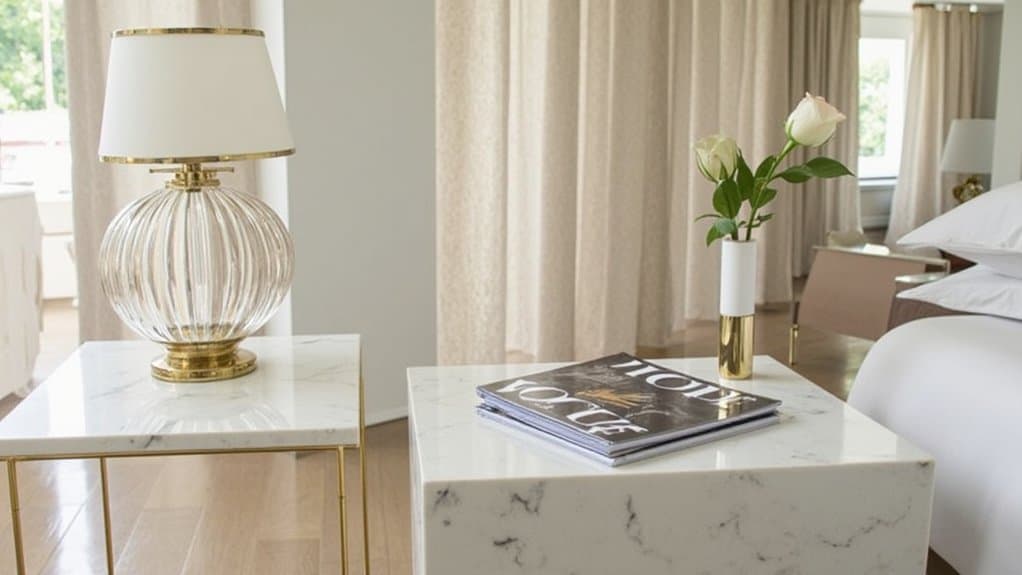 Moving from the delicate charm of a gold jewelry stand, consider enhancing your bedroom with a sophisticated marble nightstand. It’s a chic addition that elevates your space instantly with its sleek, polished look.