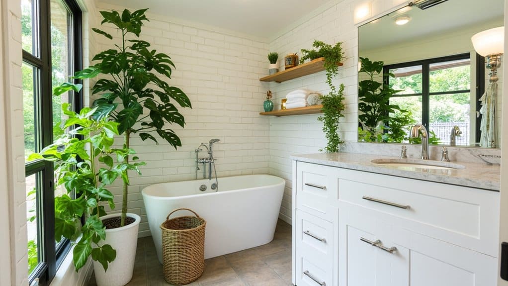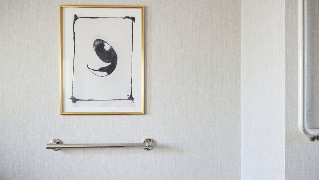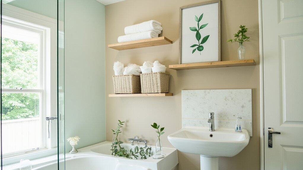 As you move on to decorating your apartment bathroom, consider adding chic wall art to boost the space’s appeal. Hang a framed print or canvas above the towel rack, ensuring it’s 5-7 inches from the top. Choose art sized 16×20 inches for small walls, and secure it with damage-free hooks.