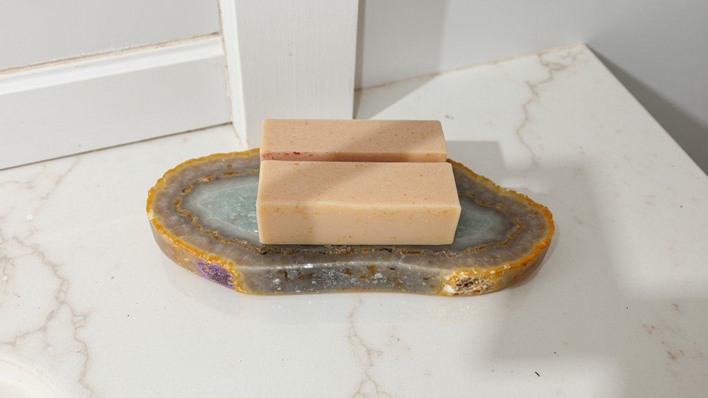 Several unique soap holders can transform your apartment bathroom from ordinary to eye-catching with minimal effort. You can pick creative designs that match your style, like vintage dishes or modern trays. Install them near the sink for easy access, taking just 10 minutes with a 6-inch wide holder.