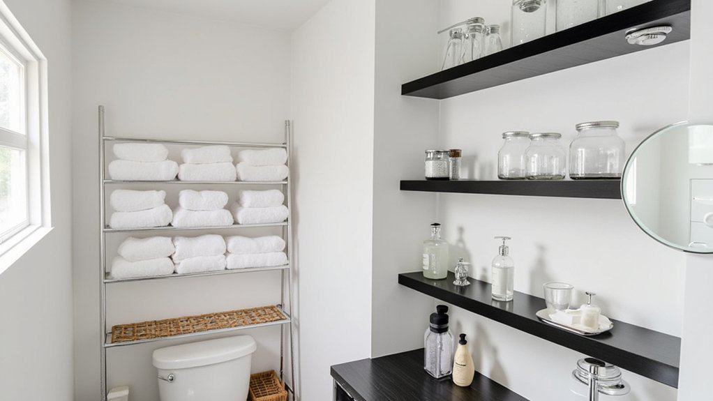 Several clever storage ideas can transform your apartment bathroom into a tidy, elegant space without much hassle. You can maximize small areas with smart solutions that look stylish. Install a 24-inch wide over-the-toilet shelf in 30 minutes for instant storage of towels and toiletries.